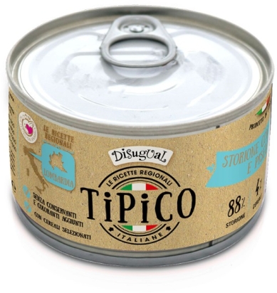 Lahodné paté Disugual Tipico jeseter se špaldou a zeleninou pro dospělé psy všech plemen. Bez umělých barviv, konzervačních látek ani látek zvýrazňující chuť.