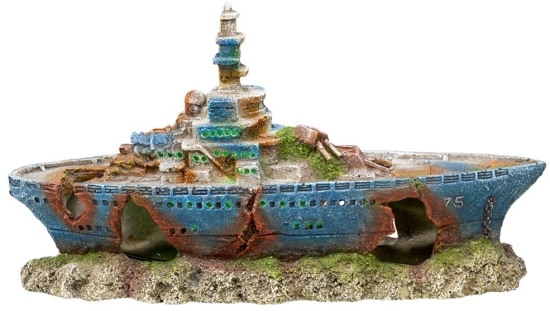 Akvarijní dekorace Nobby Vrak lodi s LED světlem. Celková velikost 27 x 7 x 14,5 cm. Vyrobeno z polyresinu. Velmi detailní provedení. Netoxické.