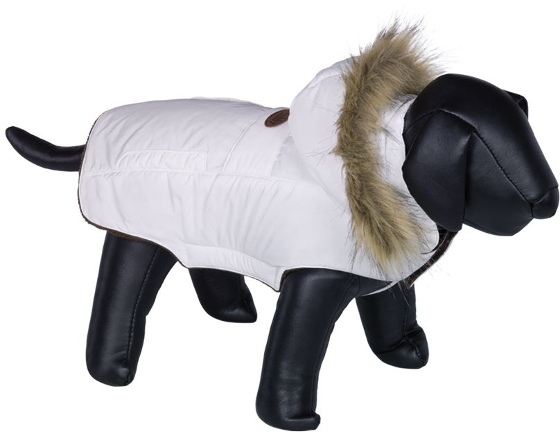 Moderní obleček Nobby ELNA pro psy. Barva bílá s odepínací kapucou (na cvočky) a kožíškem. Hřejivá fleecová podšívka. Délka 26cm, obvod krku 30-34cm, hrudník 36-45cm.