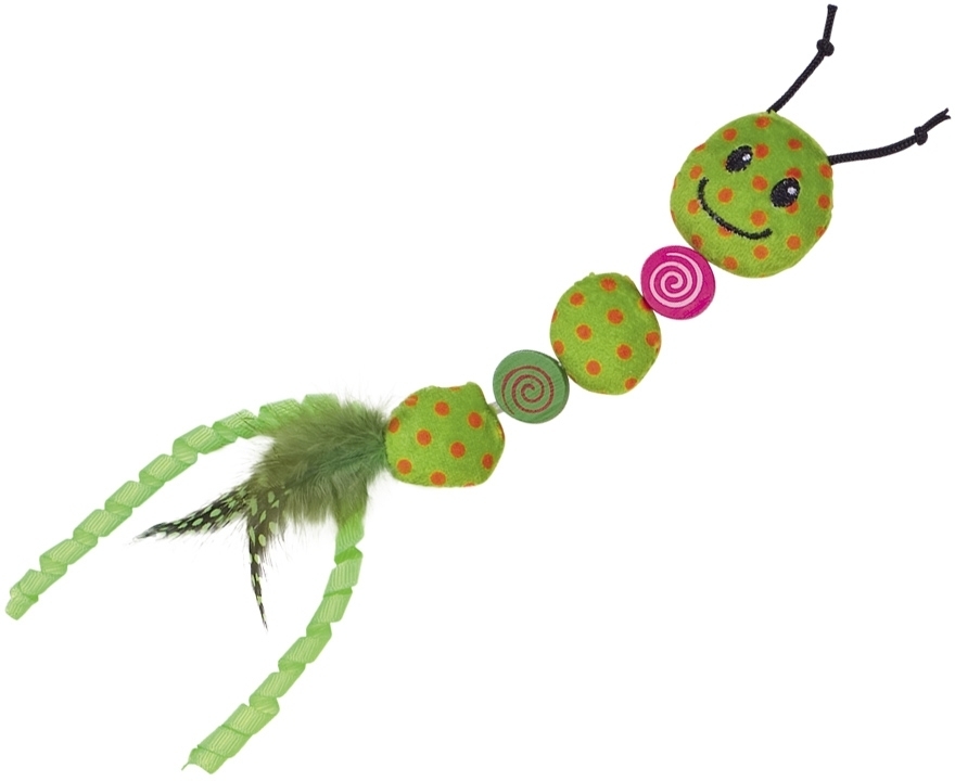 Hračka má podobu červíka a je navíc ozdobená atraktivním peříčkem, které mají kočky tak rády. Červík je plyšový a velký 24 cm.