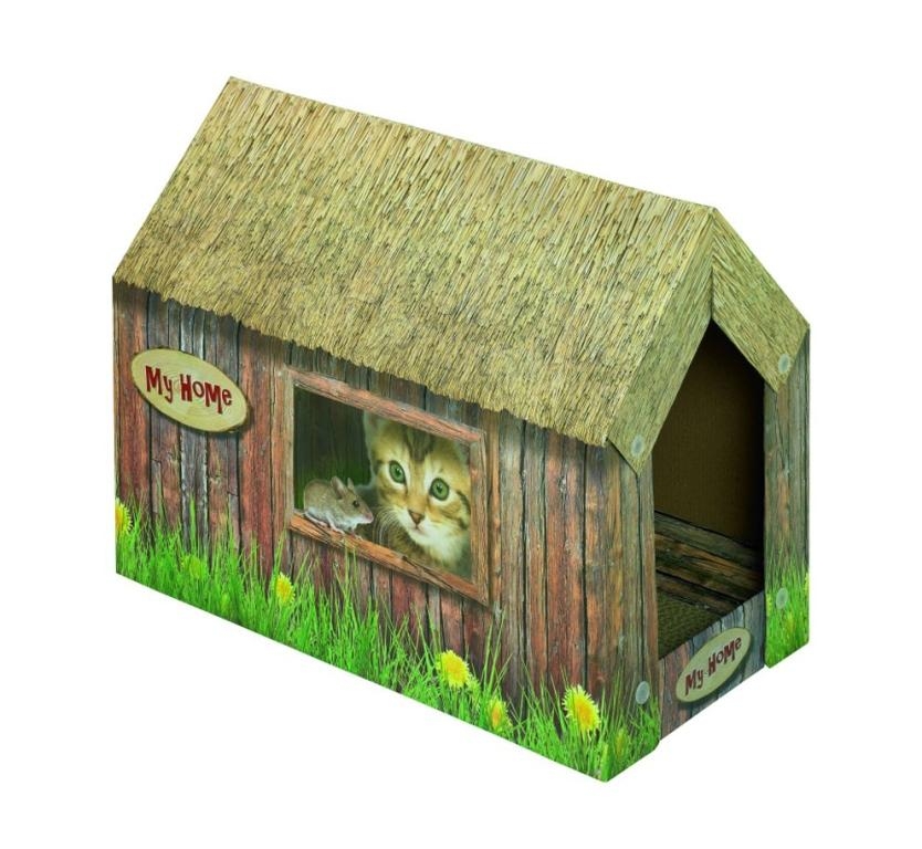Domeček pro kočku vyrobený z pevného kartonu. Uvnitř domečku kartonové škrabadlo (umožňuje kočce provozovat své škrábací zvyky, a to bez ničení nábytku nebo koberců ). Domeček dodáván společně se sušeným Catnipem (vůně Catnipu připomínající mátu peprnou neodolatelně přitahuje většinu koček.