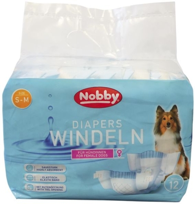 Speciální hygienické jednorázové pleny pro psy (feny) s obvodem pasu 28-40 cm. Balení 12 ks.