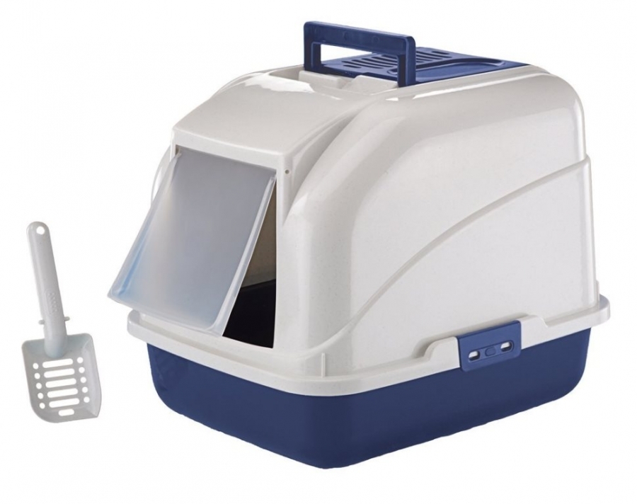 Krytá kočičí toaleta s dvířky. Pevný plast. S filtrem a lopatkou na čištění. Lze rozložit pro snadné čištění. Velikost 50x40x40cm