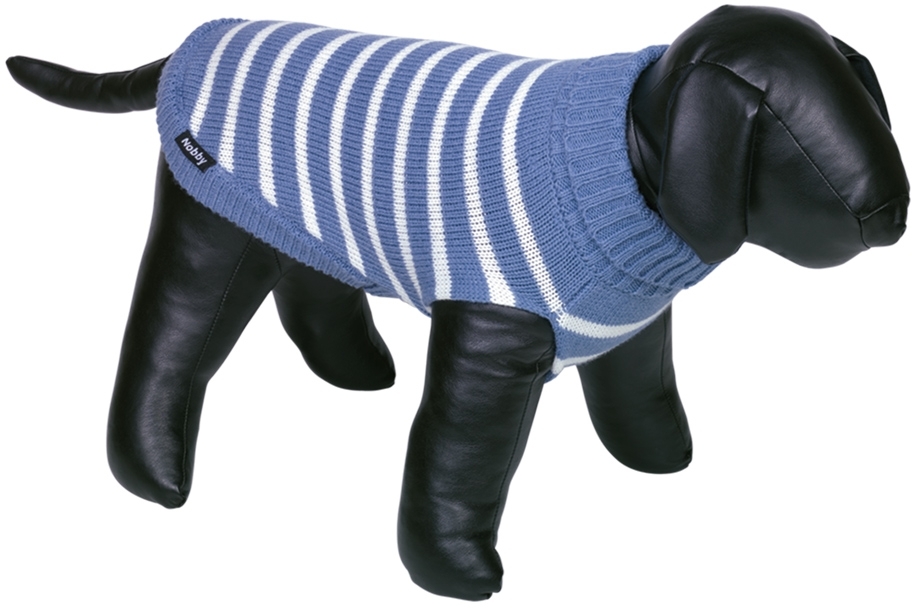 Pruhovaný svetr Nobby Pasma pro psy. Barva modrá s bílými pruhy. Pružný a měkký s nižším sklonem k žmolkování. Délka zád 23 cm, obvod hrudník 31-37 cm, obvod krku 25-30 cm.