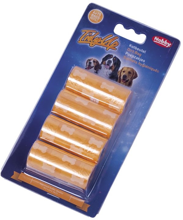 Speciální pevné sáčky na psí exkrementy. Balení 4ks rolí (15ks sáčků = 1 role, celkem tedy v balení 60ks sáčků) Na sáčkách je potisk kostiček.