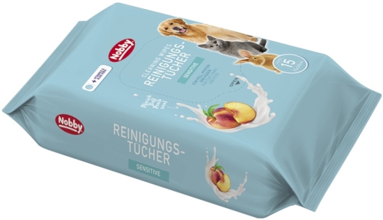 Šetrné vlhčené ubrousky Nobby pro psy a kočky. S jemnou vůní broskví. Obzvláště jemné díky vitamínu E a extraktu AloeVera. Balení 15 ks.