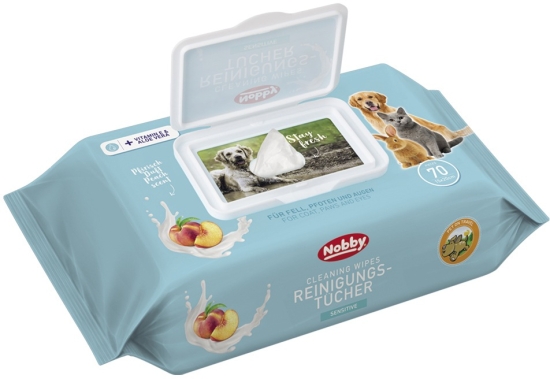 Šetrné vlhčené ubrousky Nobby pro psy a kočky. S jemnou vůní broskví. Obzvláště jemné díky vitamínu E a extraktu AloeVera.