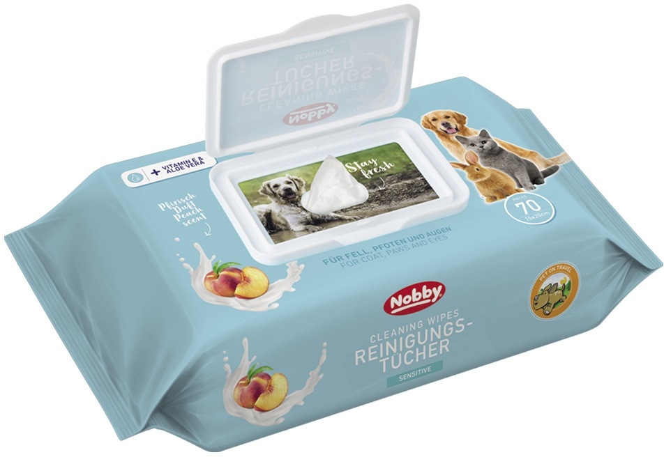 Šetrné vlhčené ubrousky Nobby pro psy a kočky. S jemnou vůní broskví. Obzvláště jemné díky vitamínu E a extraktu AloeVera. Balení 70 ks.