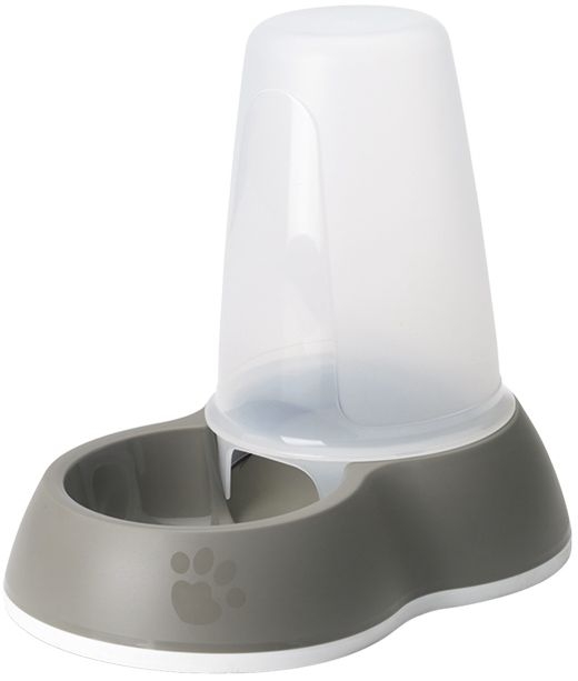 Plastový dávkovač krmiva pro psy a kočky. Objem nádoby 1,5 l. Barva tmavě šedá.